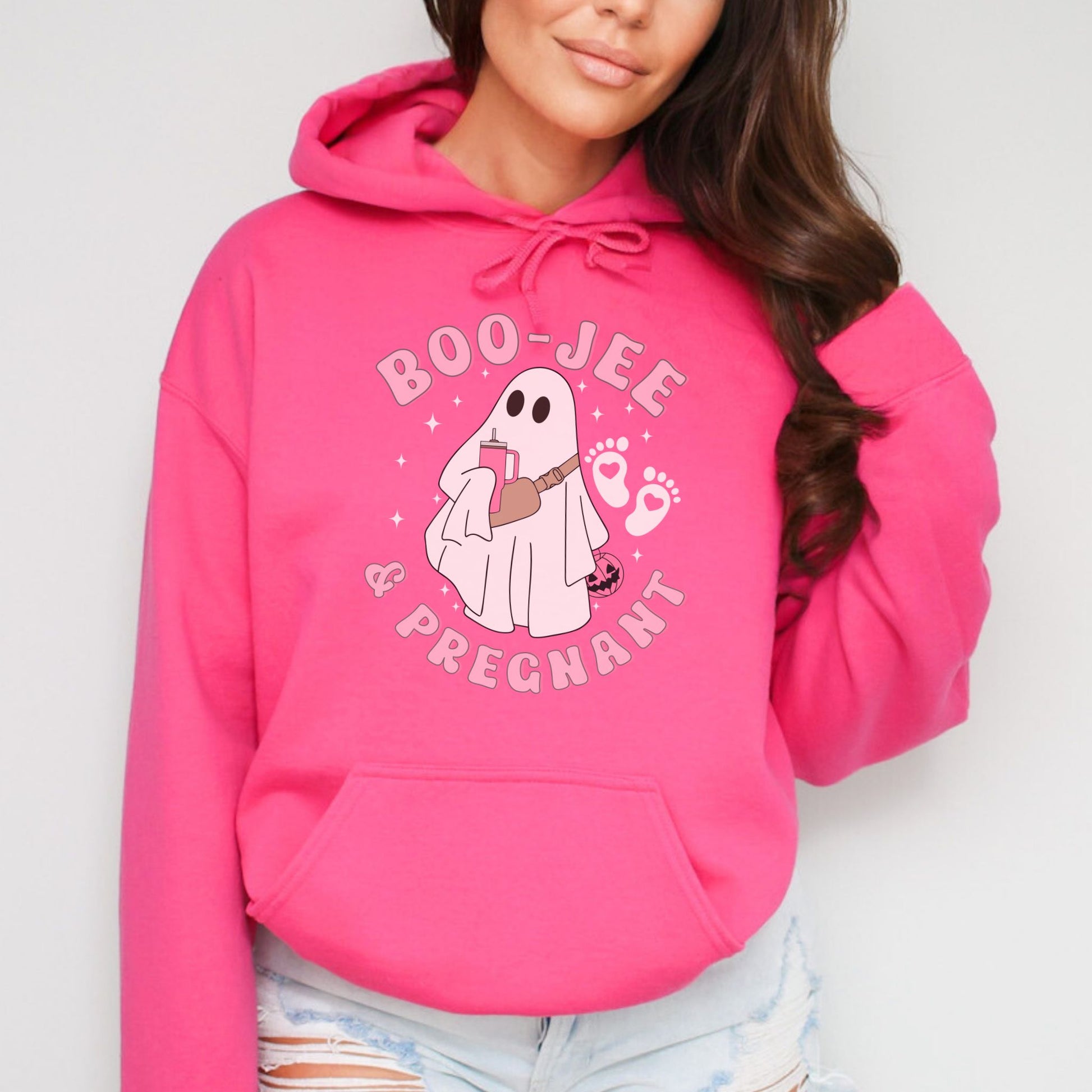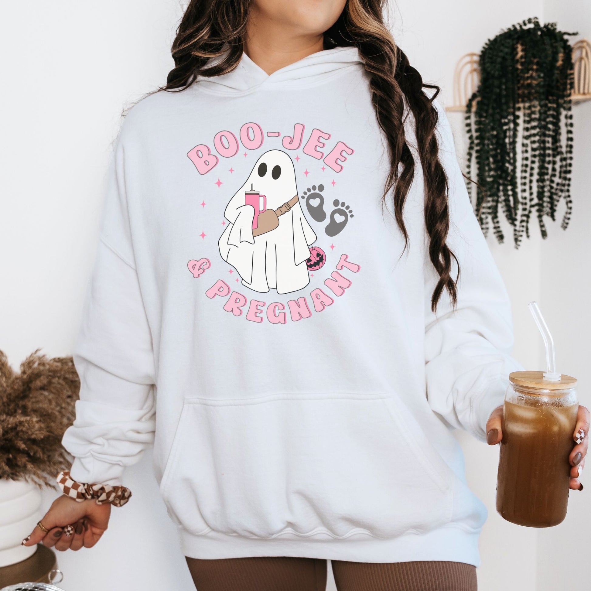 Why settle for basic when you can be Boujee and Pregnant? This Halloween pregnancy announcement hoodie is all about those high-end haunting vibes with a stylish twist for expectant moms. Whether you're planning a spooky season bash, making a fall pregnancy reveal, or just want to add some eerie elegance to your everyday maternity look, this spooky season ghost hoodie has got you covered. Don’t miss your chance to add a little ghostly glamour to your fall fashion. Grab your Halloween ghost hoodie today and boo-jee it up with the best of them, bump and all!