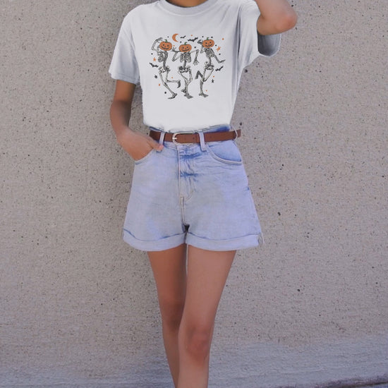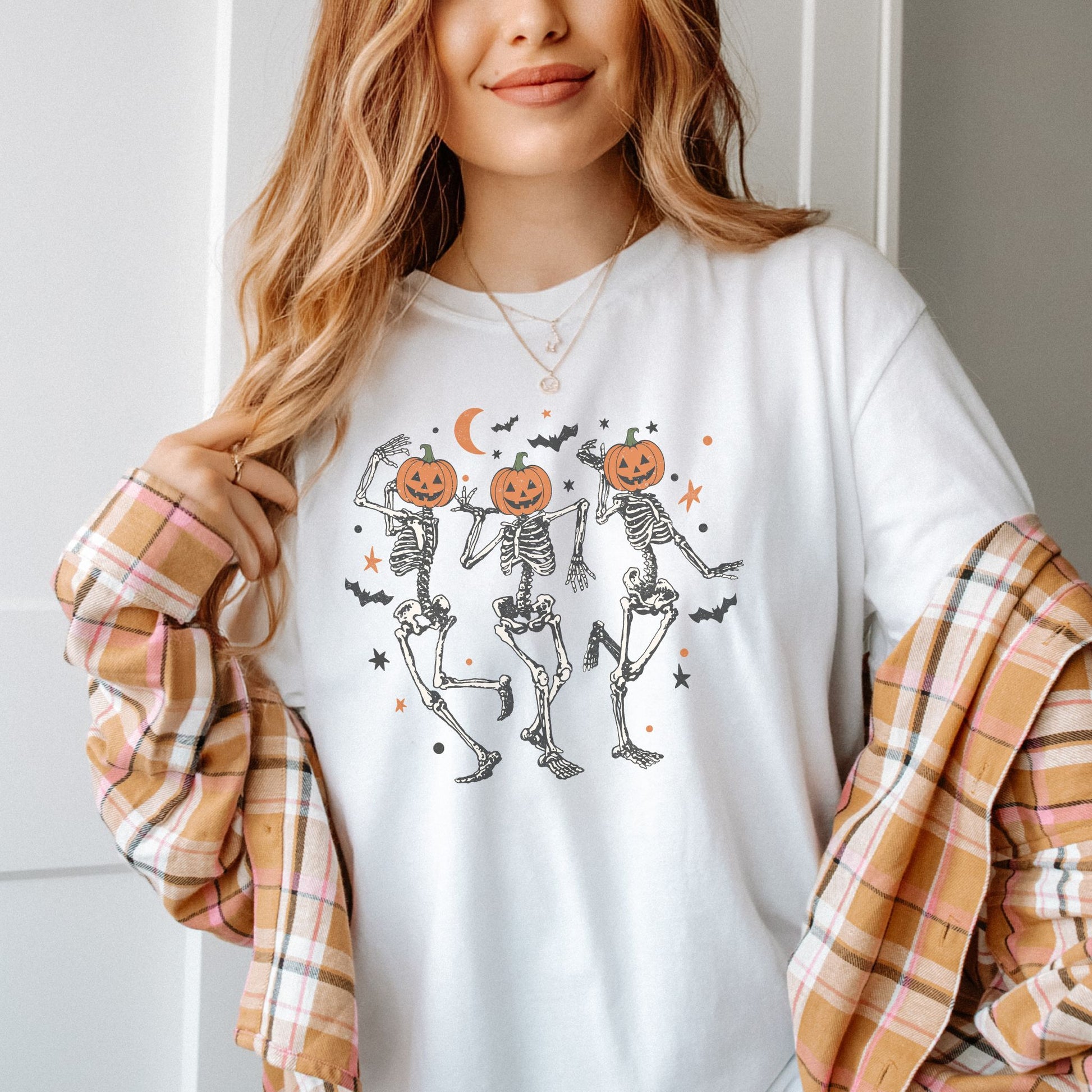 Boogie into the spooky season with our dancing pumpkin head skeleton Shirt! This retro halloween shirt is the ultimate vibe for all you Halloween-loving ladies out there. This women’s halloween shirt isn't just cute; it's downright spooktacular. Perfect for those who want to combine cuteness and creepiness in one fabulous fall look. Whether you're carving pumpkins, trick-or-treating, or just dancing around your living room, this cute fall shirt is your go-to for all things spooky. Don't be caught without it this spooky season—grab yours now and dance the fright away!