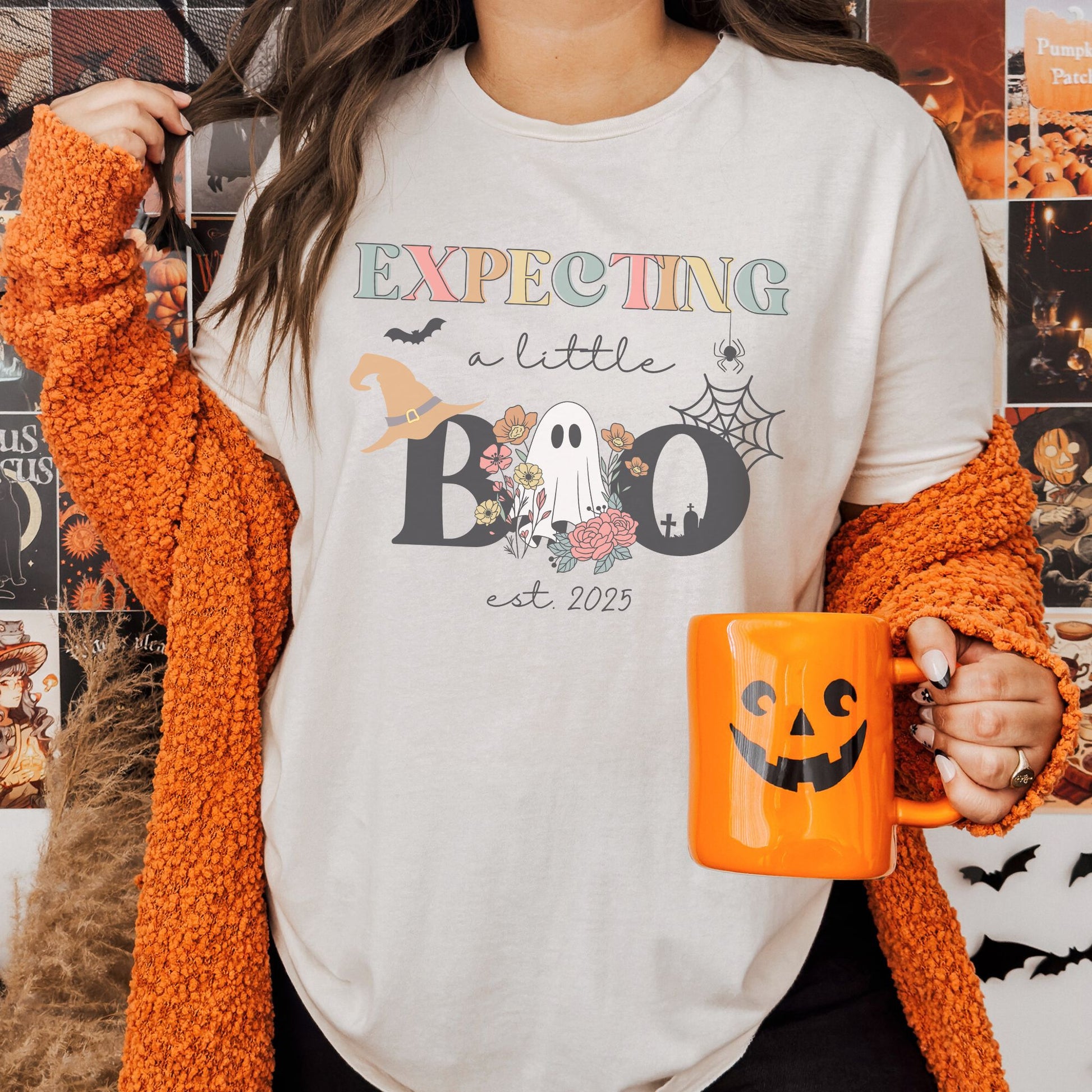 Announce your little one in spooky-cute style with this “Expecting a Little Boo” t-shirt! Featuring playful Halloween graphics, floral accents, and your baby’s due date year, it’s perfect for pregnancy reveals, baby showers, or fall maternity photoshoots. Soft, comfy, and totally boo-tiful, this tee is a must-have for any mama-to-be this Halloween season!