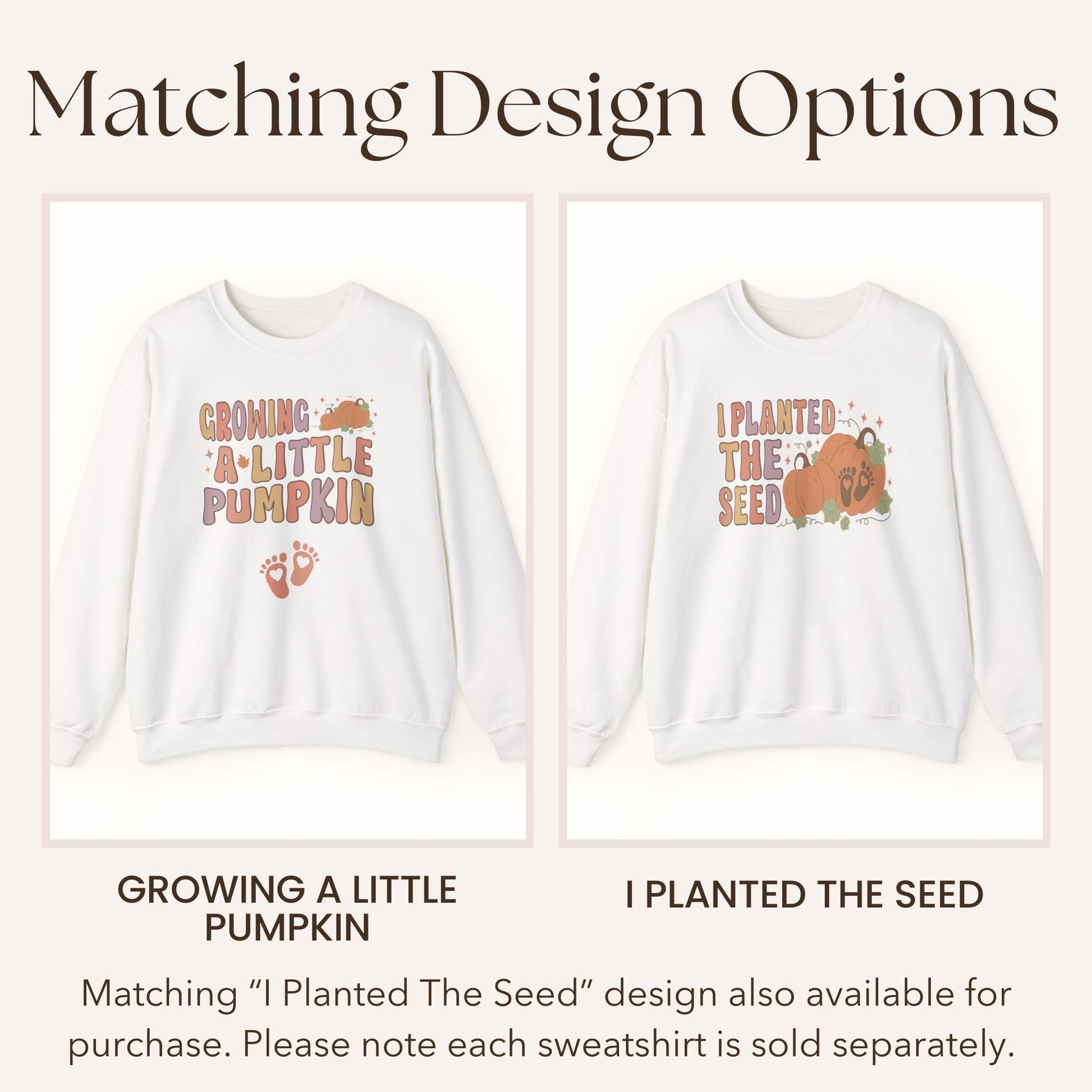 Announce your fall pregnancy with this adorable “Growing a Little Pumpkin” sweatshirt! Perfect for pumpkin patch photos, baby announcements, or cozy autumn days. It's a sweet seasonal way to show off your bump! Pair it with our matching “I Planted The Seed” sweatshirt for your partner, and announce your little pumpkin together in a fun and festive way! Each sweatshirt is sold separately.