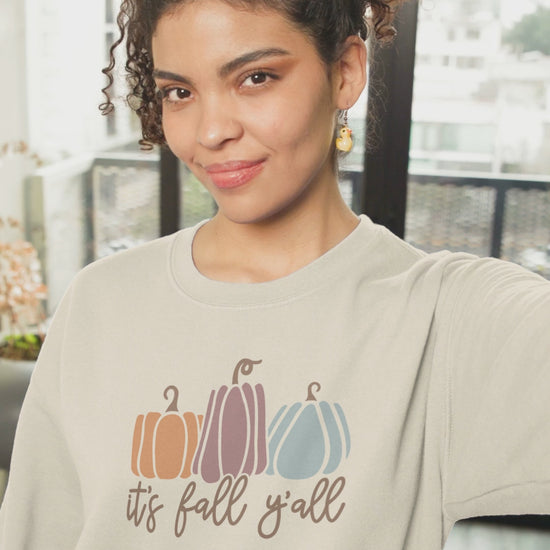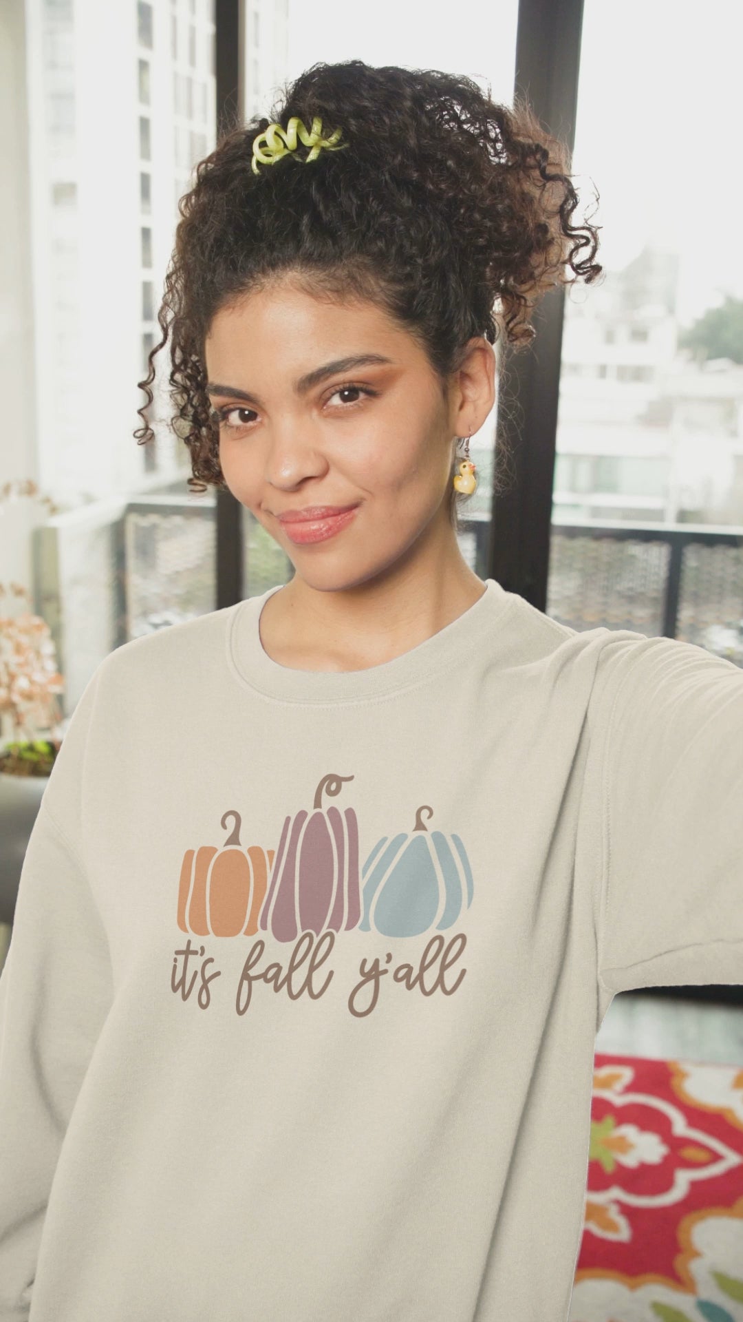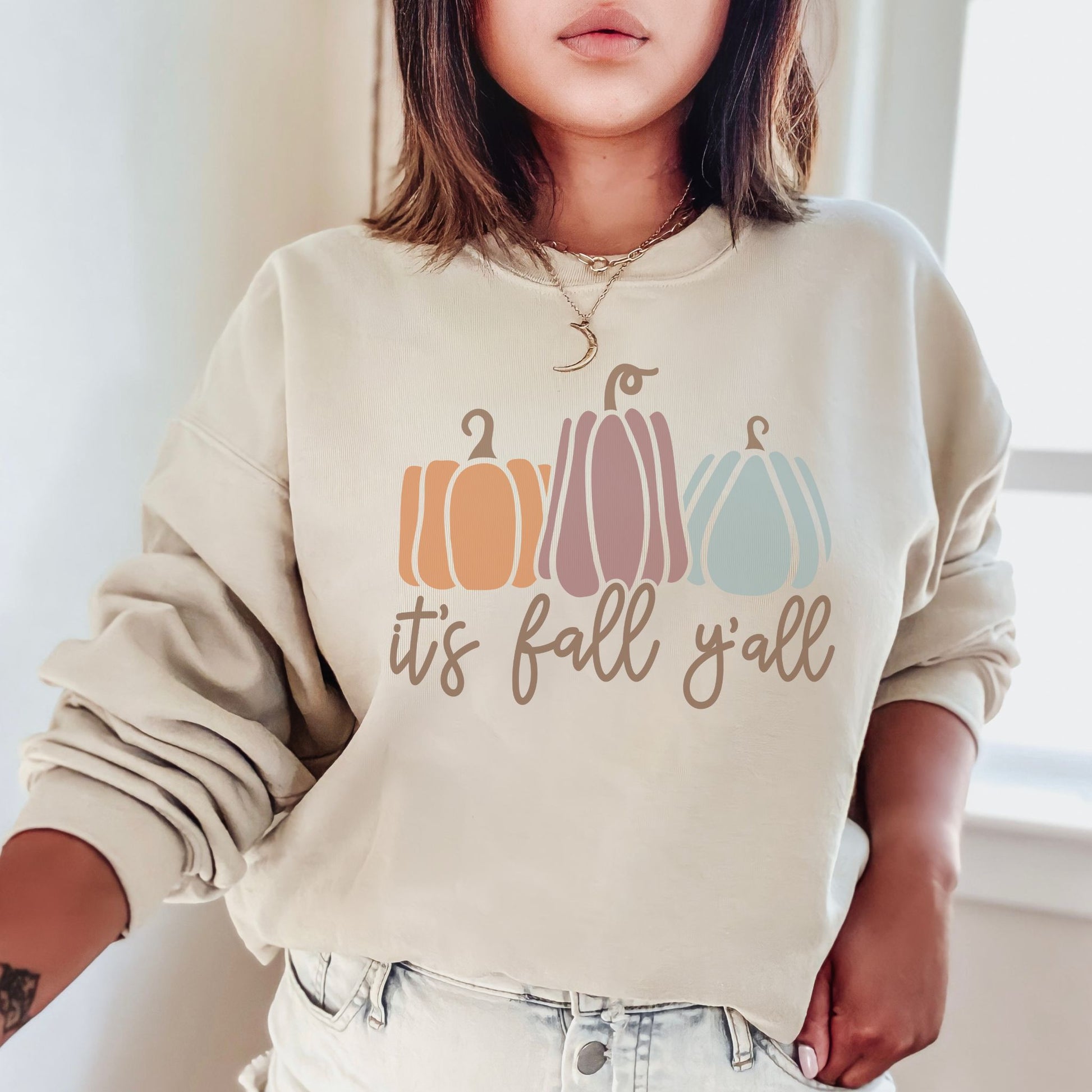 Get ready to embrace the fall vibes with our “It’s Fall Y’all” sweatshirt! This isn’t just any autumn attire—it's the ultimate fall pumpkin sweatshirt for those who want to flaunt their love for the season in style. Featuring a pumpkin so cute it might just win the “Best Dressed” award at your Thanksgiving feast, this Thanksgiving sweatshirt is perfect for gobbling up the season's festivities. Whether you're carving pumpkins, dodging cranberry sauce, or just enjoying cozy sweater weather, this autumn sweatshirt has got you covered. So, if you're ready to let everyone know that you’re all about those autumn vibes and pumpkin spice everything, grab your “It’s Fall Y’all” sweatshirt today!
