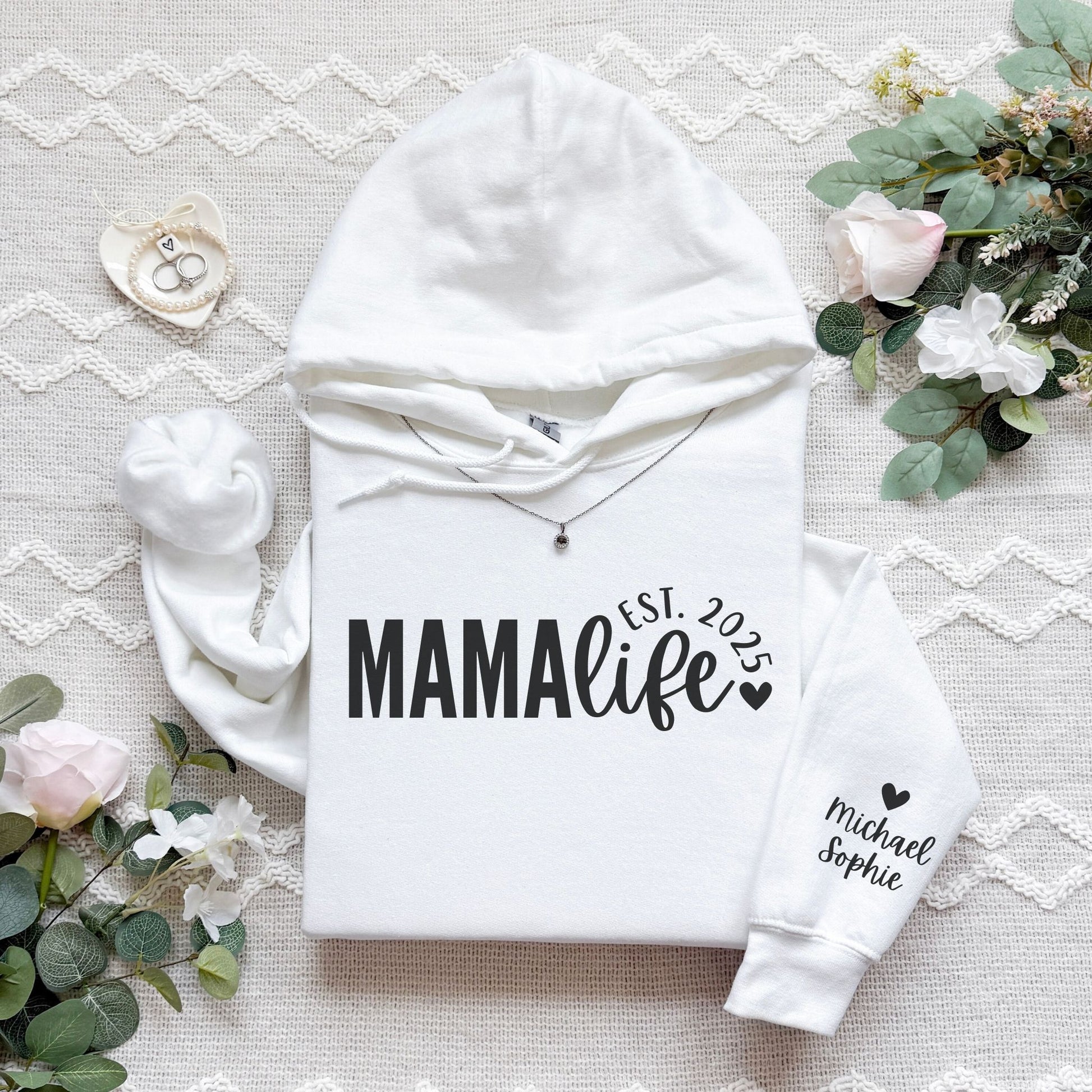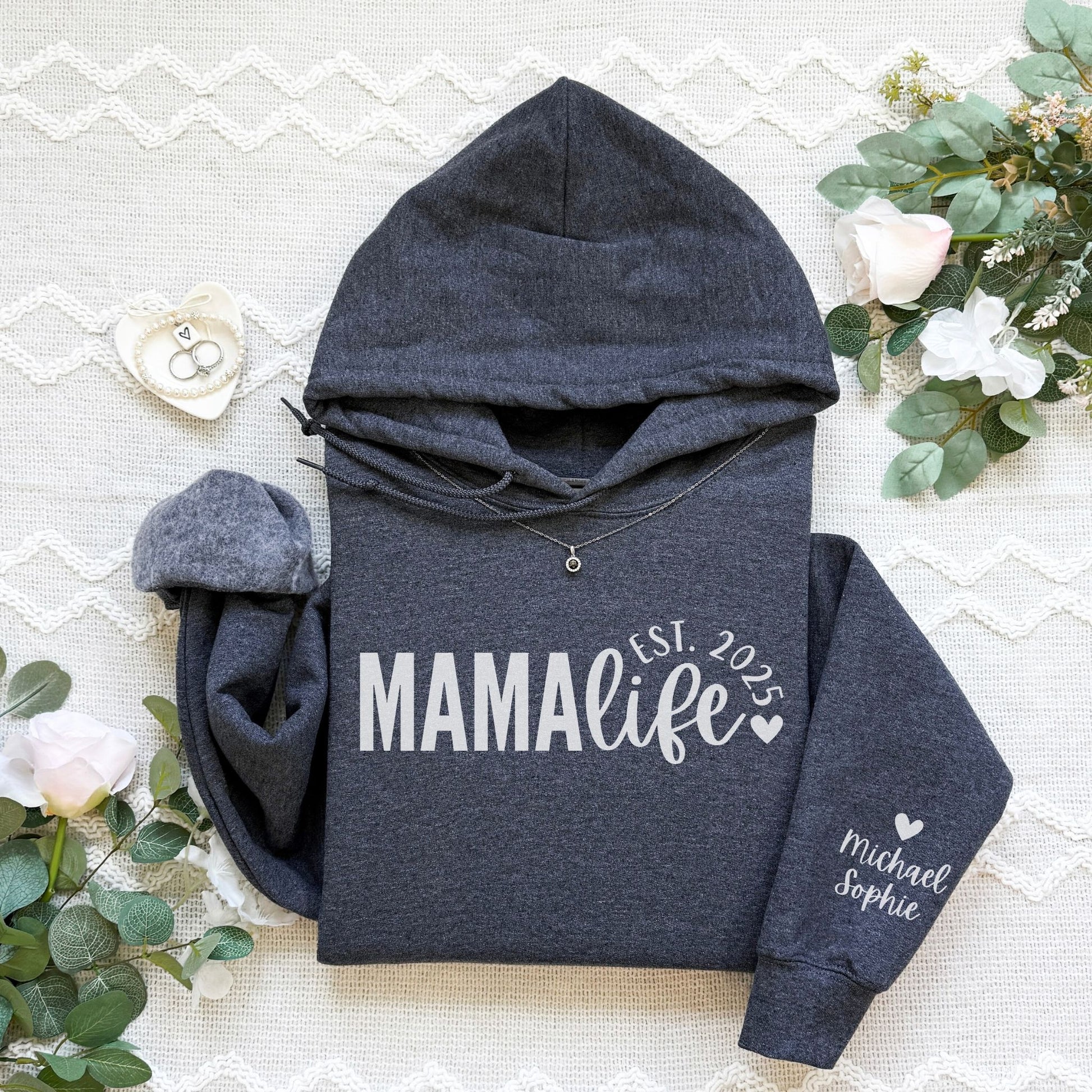 Celebrate motherhood with our custom Mama Life hoodie with kids' names on the sleeve. Our Mama Life hoodie can be personalized with the year your motherhood journey began, making it an ideal Mother’s Day gift, pregnancy announcement, or birthday gift for moms.