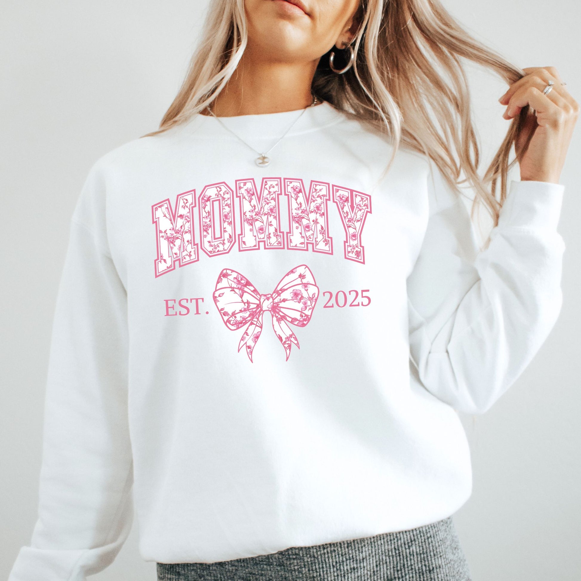 Celebrate motherhood with our charming custom Mama sweatshirt featuring elegant floral lettering and a cute bow design. Perfect for coquette-inspired moms, our EST Mama sweatshirt can be personalized with the year your motherhood journey began, making it an ideal Mother’s Day gift, pregnancy announcement, or birthday gift for moms.