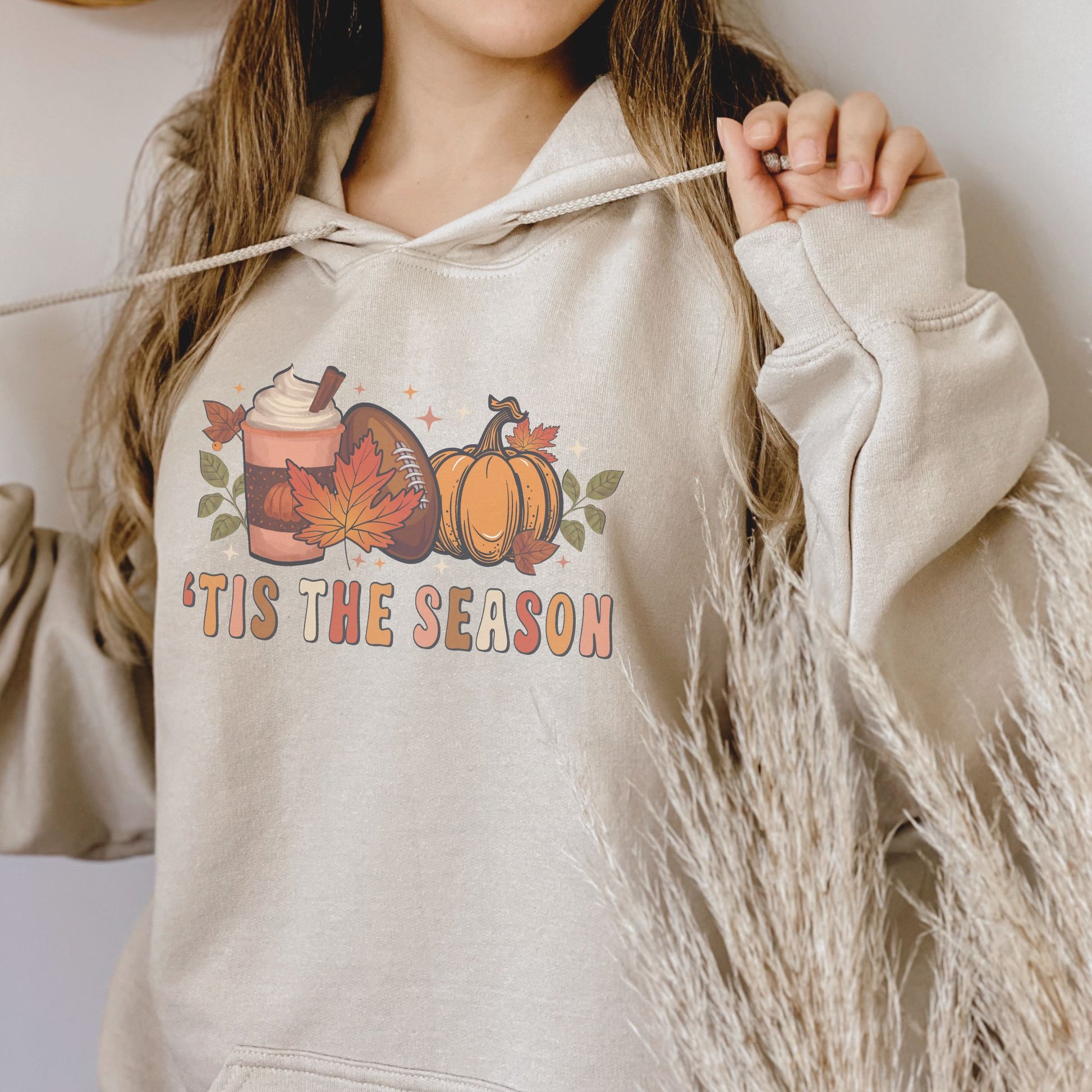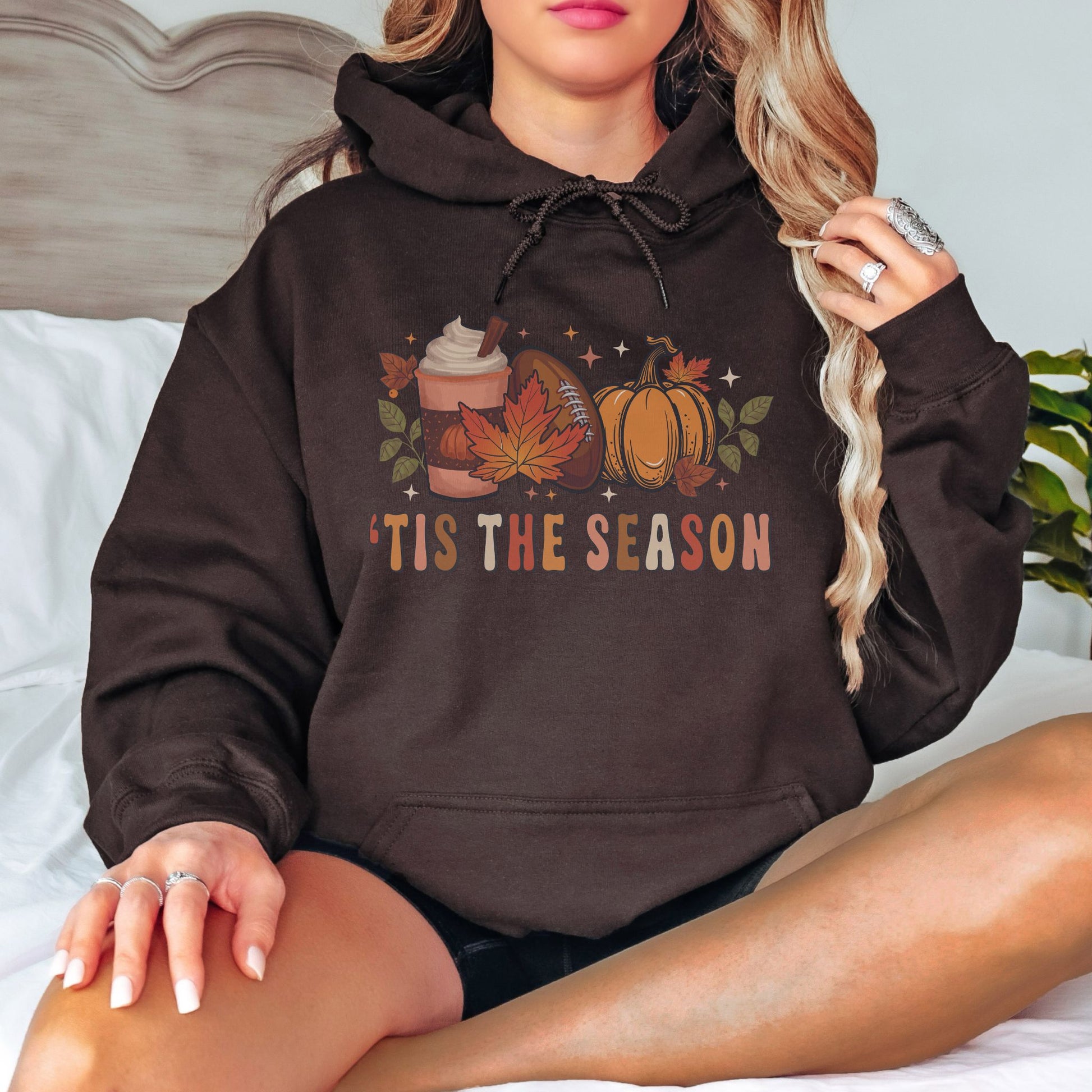 Fall into style with our "'Tis the Season" fall football hoodie! If you’re a coffee-sipping, pumpkin-picking, football fanatic, this hoodie is the perfect blend of all your autumn favorites. Whether you're cheering on your favorite team, sipping on a pumpkin spice latte, or just enjoying the crisp autumn air, this fall coffee hoodie has got you covered. Featuring a playful design that celebrates all things fall, it’s perfect for those who believe that ‘tis the season for football, pumpkins, and endless cups of coffee. Why settle for one fall favorite when you can have them all? Embrace the season with a hoodie that celebrates everything you love about autumn. Grab your "'Tis the Season" fall football hoodie today and get ready to score some major style points this season!