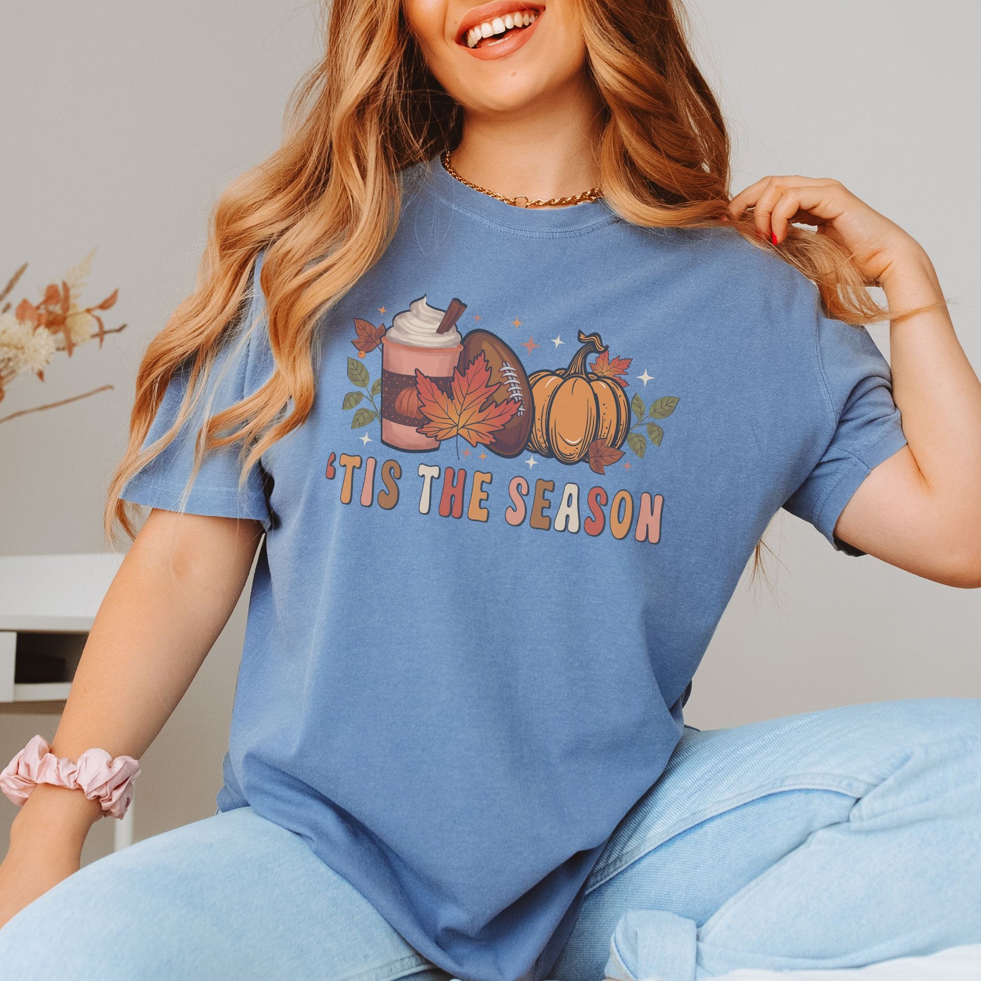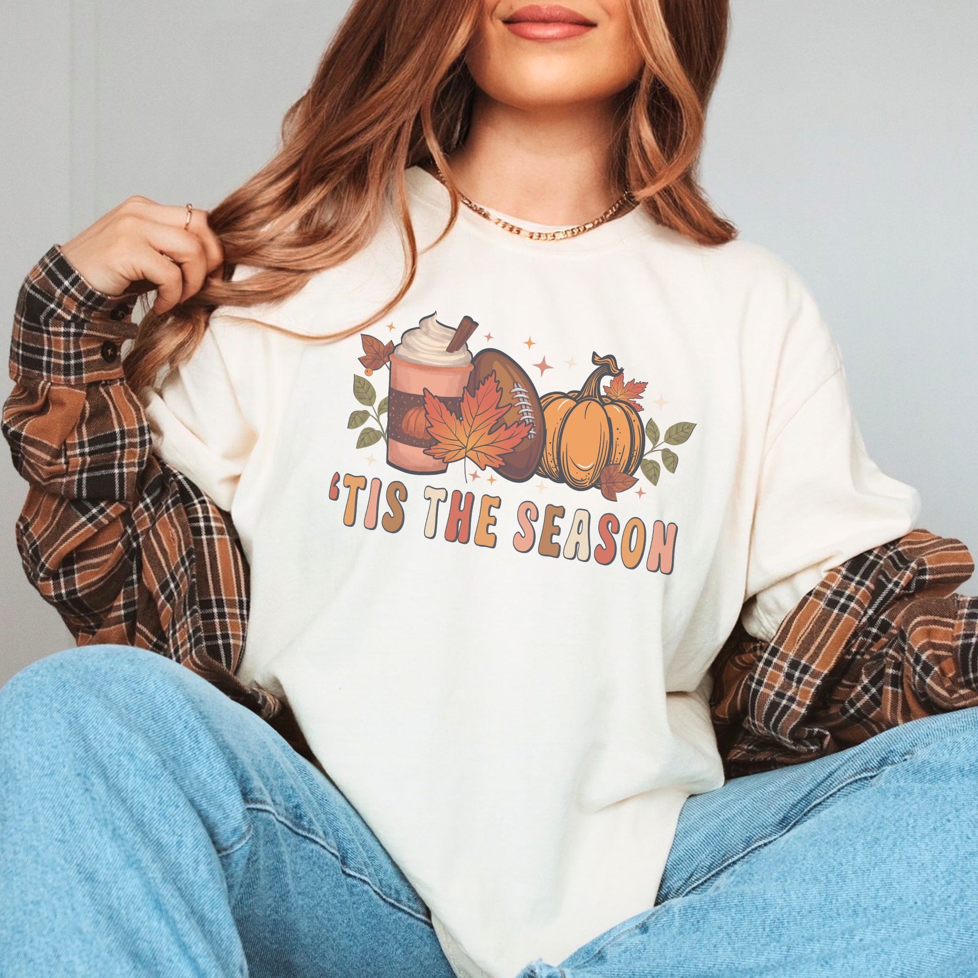Fall into style with our "'Tis the Season" fall football shirt! If you’re a coffee-sipping, pumpkin-picking, football fanatic, this shirt is the perfect blend of all your autumn favorites. Whether you're cheering on your favorite team, sipping on a pumpkin spice latte, or just enjoying the crisp autumn air, this fall coffee shirt has got you covered. Featuring a playful design that celebrates all things fall, it’s perfect for those who believe that ‘tis the season for football, pumpkins, and endless cups of coffee. Why settle for one fall favorite when you can have them all? Embrace the season with a shirt that celebrates everything you love about autumn. Grab your "'Tis the Season" fall football shirt today and get ready to score some major style points this season!